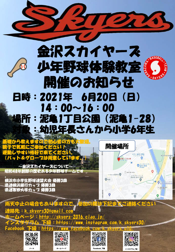 金沢スカイヤーズ少年野球体験野球教室を開催します。